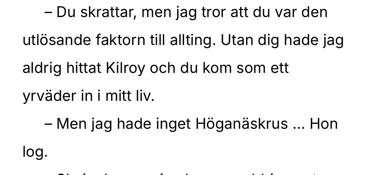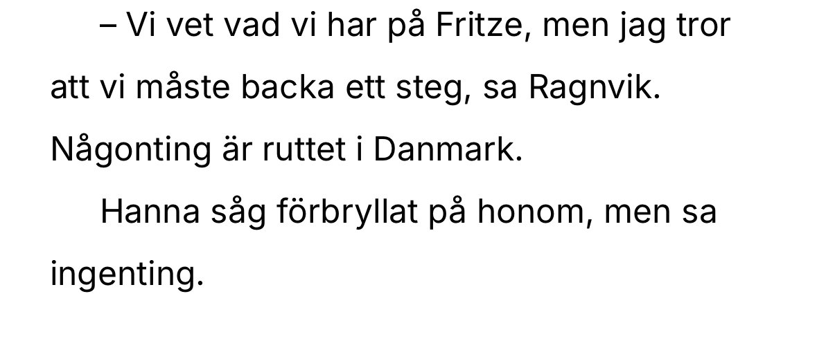 Ibland funderar jag på hur det är att skapa en familj, som får möta så många utmaningar på så många plan. Utan att spoila så finns det många familjehemligheter i familjen Ragnvik, som sakta men säkert nystas upp (vad väntar för nya ”hemlighet” i nästa bok). Och jag tänker att han måste ha varit förtjust av att låta Ragnvik bli kär i Maxinne, en chokladfärgad skönhet med rötter i södra Afrika och som jobbar som privatdetektiv och hyfsat ofta kommer nära de fall som Ragnvik ska lösa. Och Maxinne tycks ha en lite annan relation till lagen än hennes älskade kommissarie. Detta öppnar för oändliga konsekvenser, med allt från raseriutbrott till samarbeten.