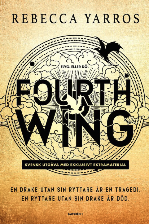 Bild: Omslag till boken ”Fourth wing av Rebecca Yaros. Criklar med moln och en liten drake och texten ”flyg, eller dö” och undertexten ”En draka utan sin ryttare är en tragedi. En ryttare utan sin drake är död.”
