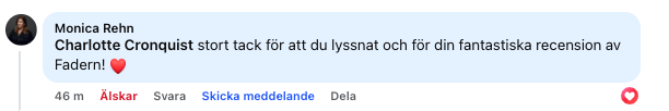 Jag gillar verkligen Fadern och har bara en liten invändning: Det finns egentligen ingen i boken som jag känner sympati för. (Det skulle kanske vara Ellinor, men hon är ju död från början). Det är som att personerna i boken är motsägelsefulla, självupptagna, lögnaktiga och där somliga är beredda att gå över lik för att en acceptabel verklighetsbild ska bli något slags allmän sanning. Självklart blottlägger författaren mycket av detta i boken.