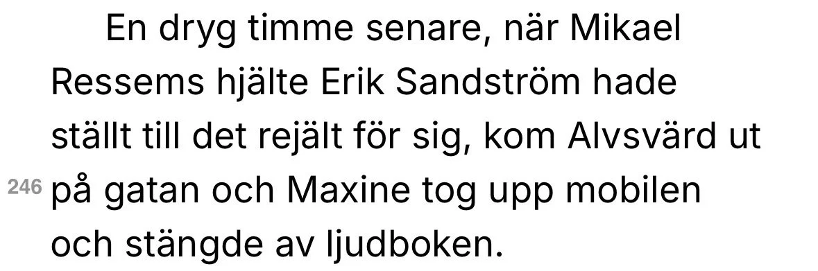 ”En dryg timme senare, när Mikael Ressems hjälte Erik Sandström hade ställt till det rejält för sig, kom Alvsvärd ut på gatan och Maxine tog upp mobilen och stängde av ljudboken.”